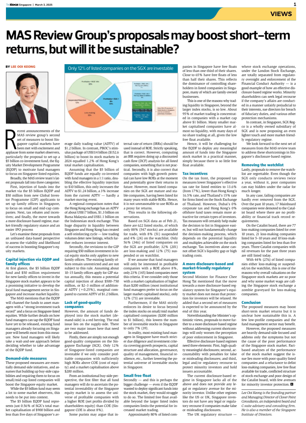 The Edge Singapore featured my article on 3 March 2025 where I take a fact-based approach to examine MAS’ plans to revive the SG stock mkts.