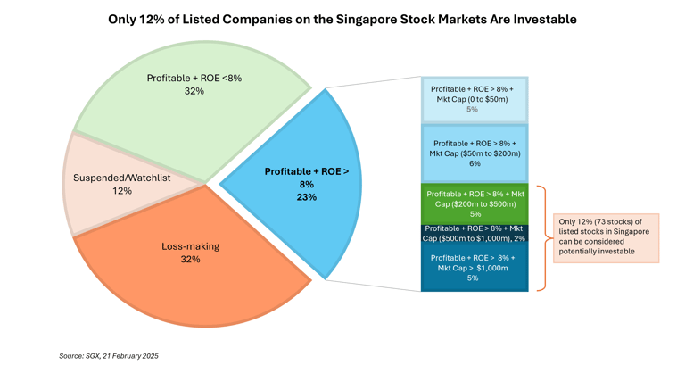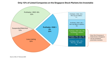 Firstly, there are simply not enough good quality companies on the Singapore stock exchange. Only 12% of Singapore listed companies are investable if we only consider profitable companies with sufficiently high ROEs above COE (Cost of Equity) and a market capitalization above $200 million.