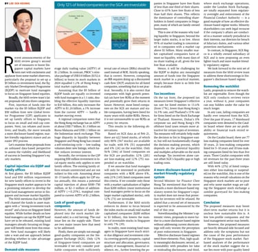 In conclusion, the proposed measures may boost short-term market returns but it is unclear how sustainable this is. A few low-profile companies and the fund management sector may benefit. However, the proposed measures are heavily demand-side focused and only address the symptoms but not the cause of the poor performance of the Singapore stock market.