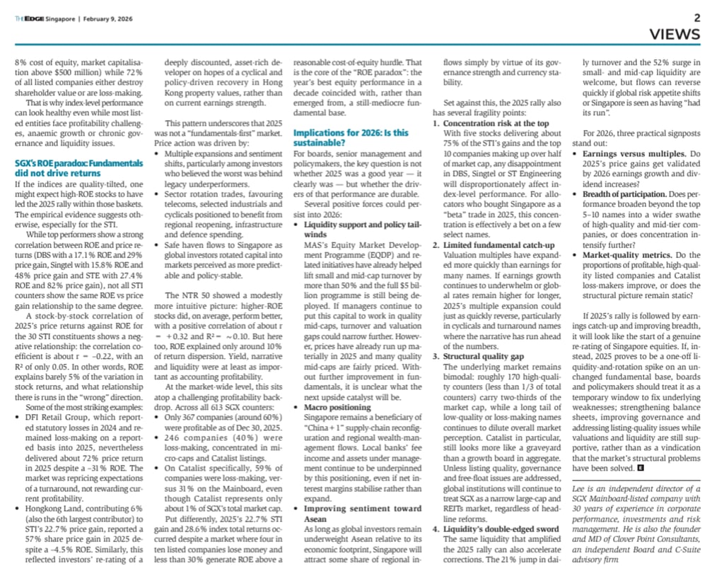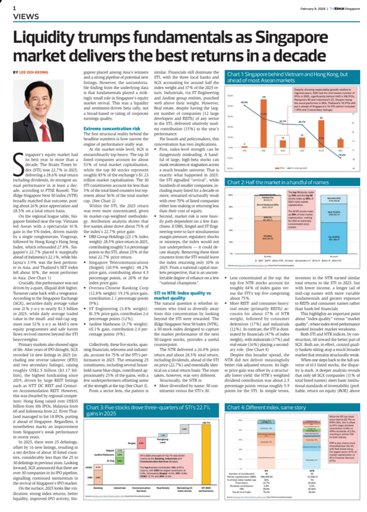 The Edge Singapore featured my article "Liquidity Trumps Fundamentals as Singapore's Market Delivers Best Returns in a Decade" on 16 February 2026.