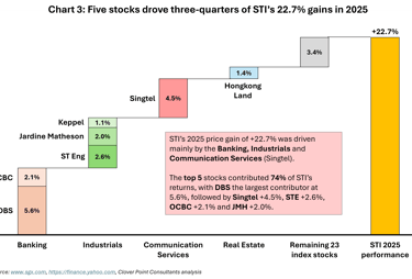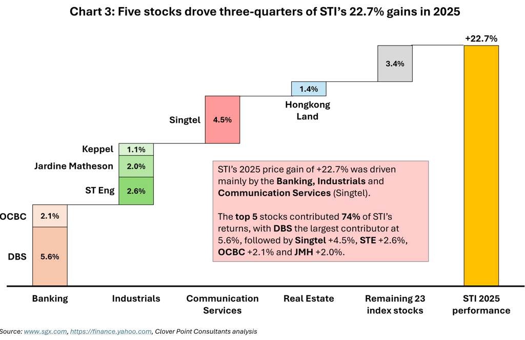Within the STI, 2025’s return was even more concentrated, given its market cap-weighted methodology. Attribution analysis shows that five names alone drove about 75% of the index’s 22.7% price gain: