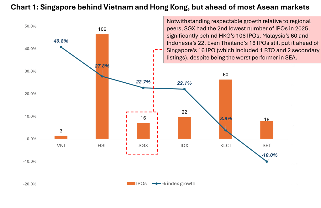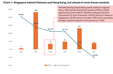 Primary markets also showed signs of life. After years of IPO drought, SGX recorded 16 new listings in 2025 (including 1 RTO and 2 secondary listings), raising roughly US$2.5 billion, the highest fundraising since 2019, driven by large REIT listings such as NTT DC REIT and Centurion Accommodation REIT. However, this was dwarfed by regional competitors; Hong Kong raised over US$35 billion from 106 IPOs, Malaysia delivered 60 IPOs and Indonesia 22 IPOs. Even Thailand managed to list 18 IPOs, putting it ahead of Singapore. Regardless, it nonetheless marks an improvement from Singapore’s weak performance in recent years.