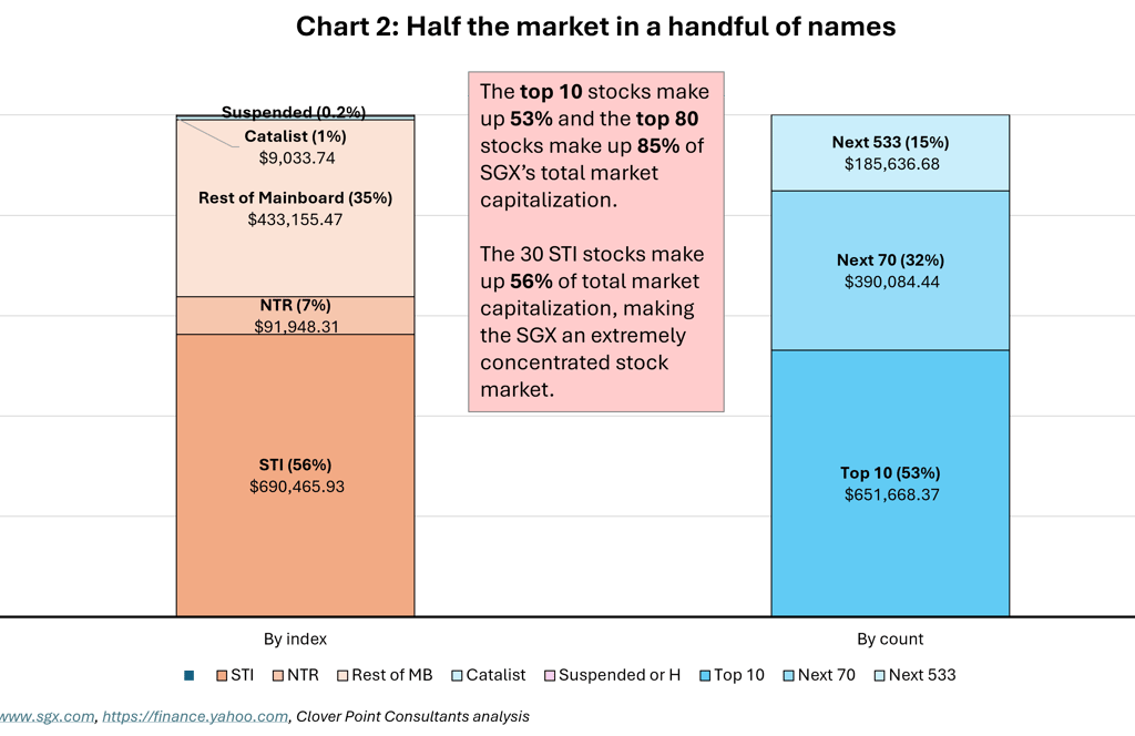 Both STI and NTR indices, by construction, tilt toward the better part of SGX. Both are, in effect, curated quality baskets sitting atop a much broader market that remains structurally weak.