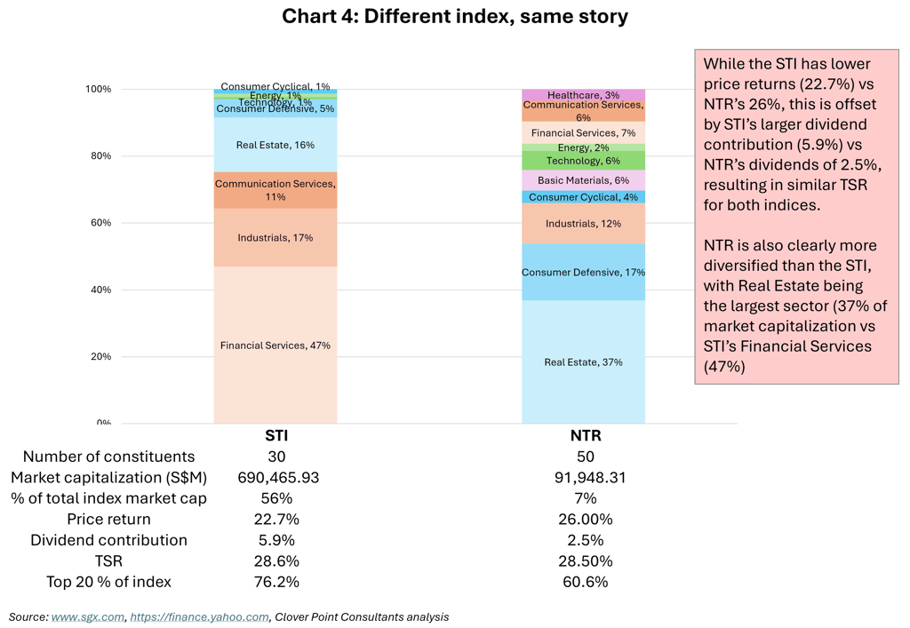 Less concentrated at the top: the top 5 NTR stocks account for roughly 44% of index gains versus the STI’s top 5 comprising about 75%.