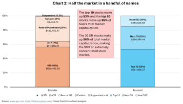 At the market‑wide level, SGX is extraordinarily top‑heavy. The top 10 listed companies account for about 53% of total market capitalisation, while the top 80 stocks represent roughly 85% of the exchange’s S$1.23 trillion market capitalization. The 30 STI constituents (less than 5% of total listed counters) alone represent about 56% of total market cap. (See Chart 2)