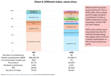 More REIT‑ and consumer‑heavy: real estate (primarily REITs) represents around 37% of NTR weight, followed by consumer defensives (17%) and industrials (12%). In contrast, the STI is dominated by financials (47% of index weight), with industrials (17%) and real estate (16%) playing a secondary role (See Chart 4).
