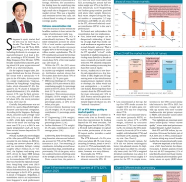Second, market risk is now heavily path‑dependent on a few franchises. If DBS, Singtel and STE were to face simultaneous margin pressure, regulatory shocks or missteps, the index would not just underperform – it could de‑rate sharply. Remove these three counters from the STI and the index returns only 10% in 2025! From a national capital‑markets perspective, that is an uncomfortable degree of reliance on a few ‘national champions’.