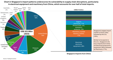 Given that China remains both Singapore’s largest import and export market—with 53% of imports comprising electrical equipment and machinery—more stringent application of Chinese origin rules could inadvertently impact Singaporean firms exporting similar goods to the U.S., where 50% of Singapore’s top exports also consist of electrical equipment and machinery.