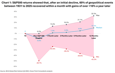 BCA’s review of 88 geopolitical risk events – from the 1931 Mukden incident to the Iran-Israel conflict in 2025 – shows markets typically fall 9% after a shock, but recover +1.2% in a month, and over +10% within a year. (See Chart 1)